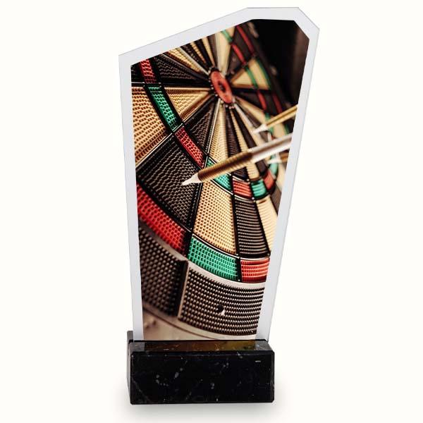 Trofeos de metacrilato prisma con imagen de dardos impresa a todo color, sobre base de mármol.