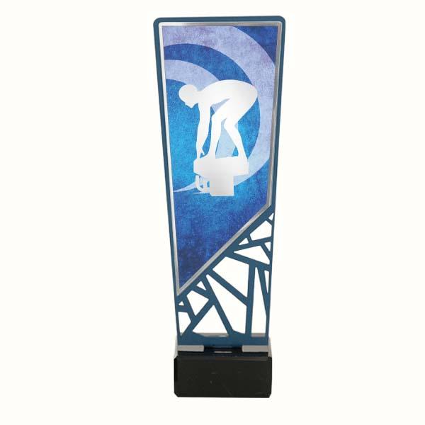 Iron trophy painted in blue with printed aluminum sheet, on marble base.