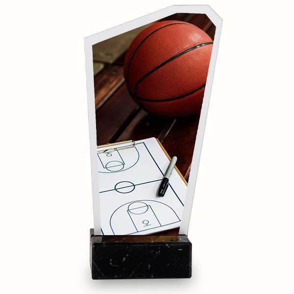 Trophées en prisme de méthacrylate avec image de basket imprimée en couleur, sur base en marbre.