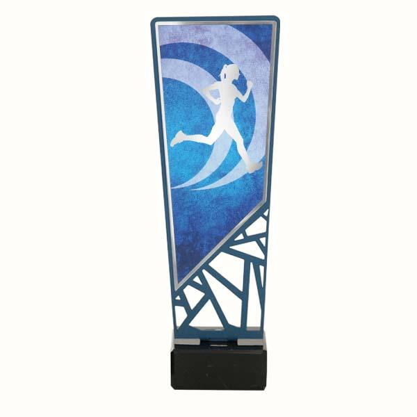 Trophée d'athlétisme féminin en fer peint en bleu avec plaque en aluminium imprimée, sur base de marbre.